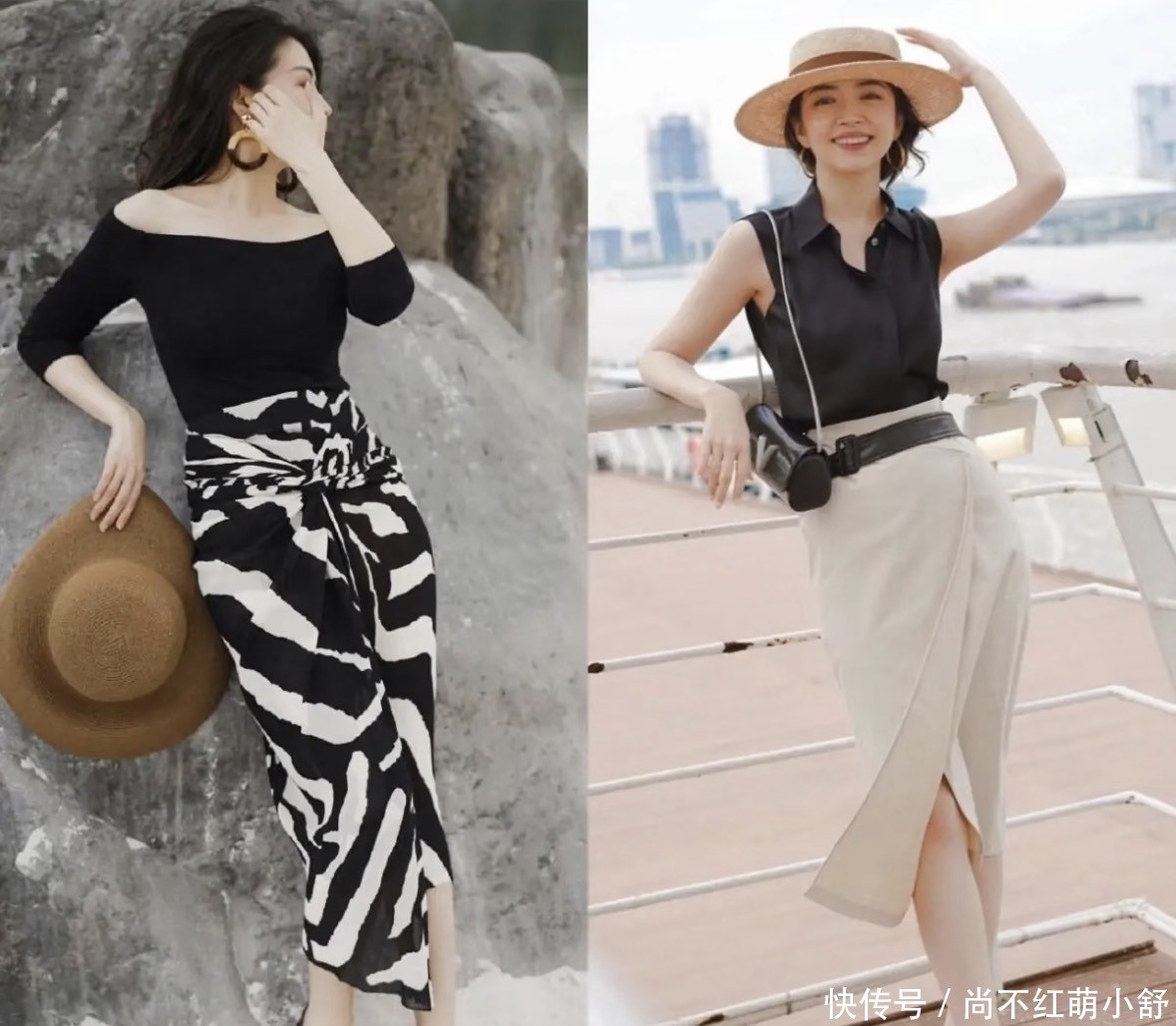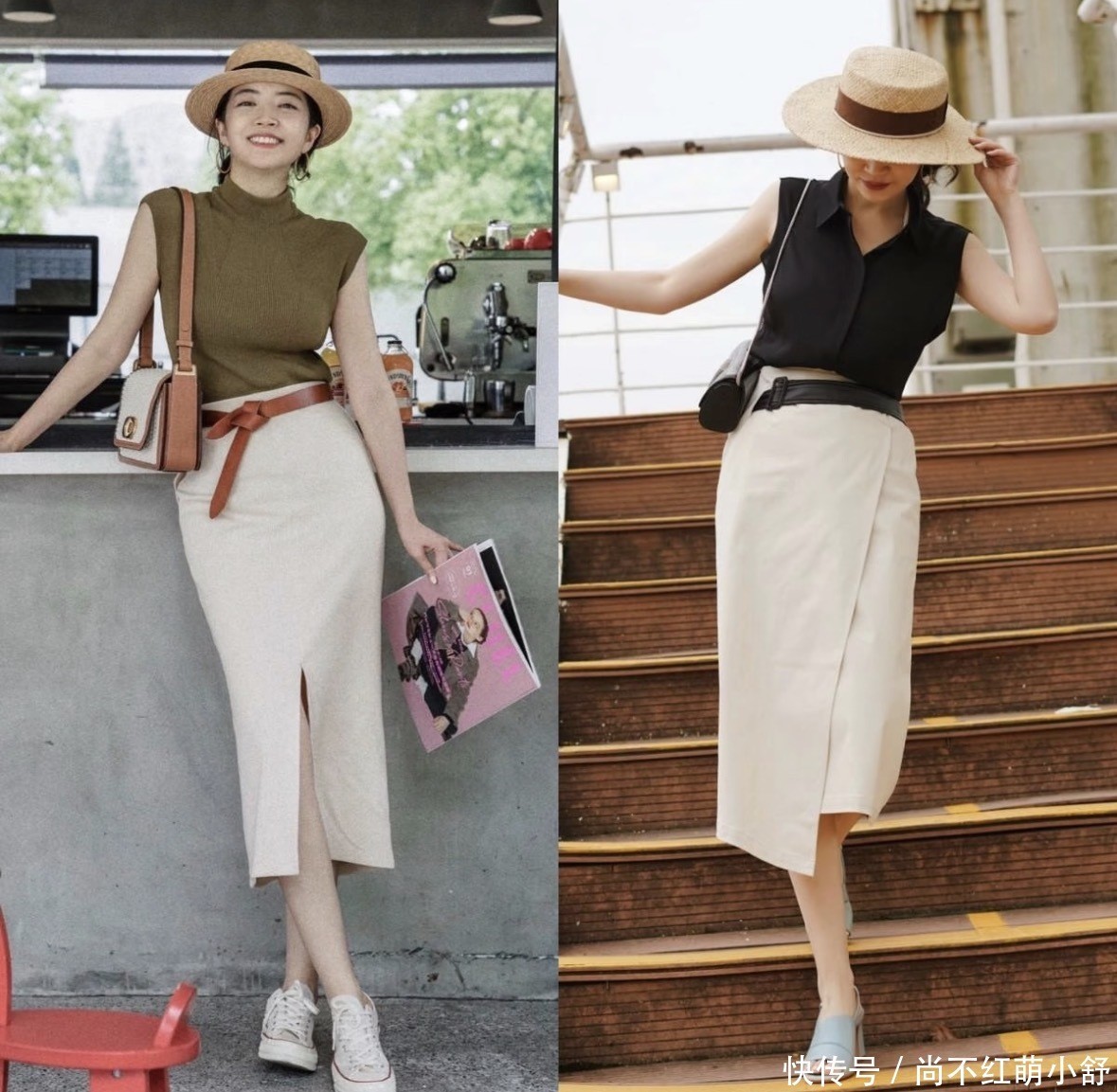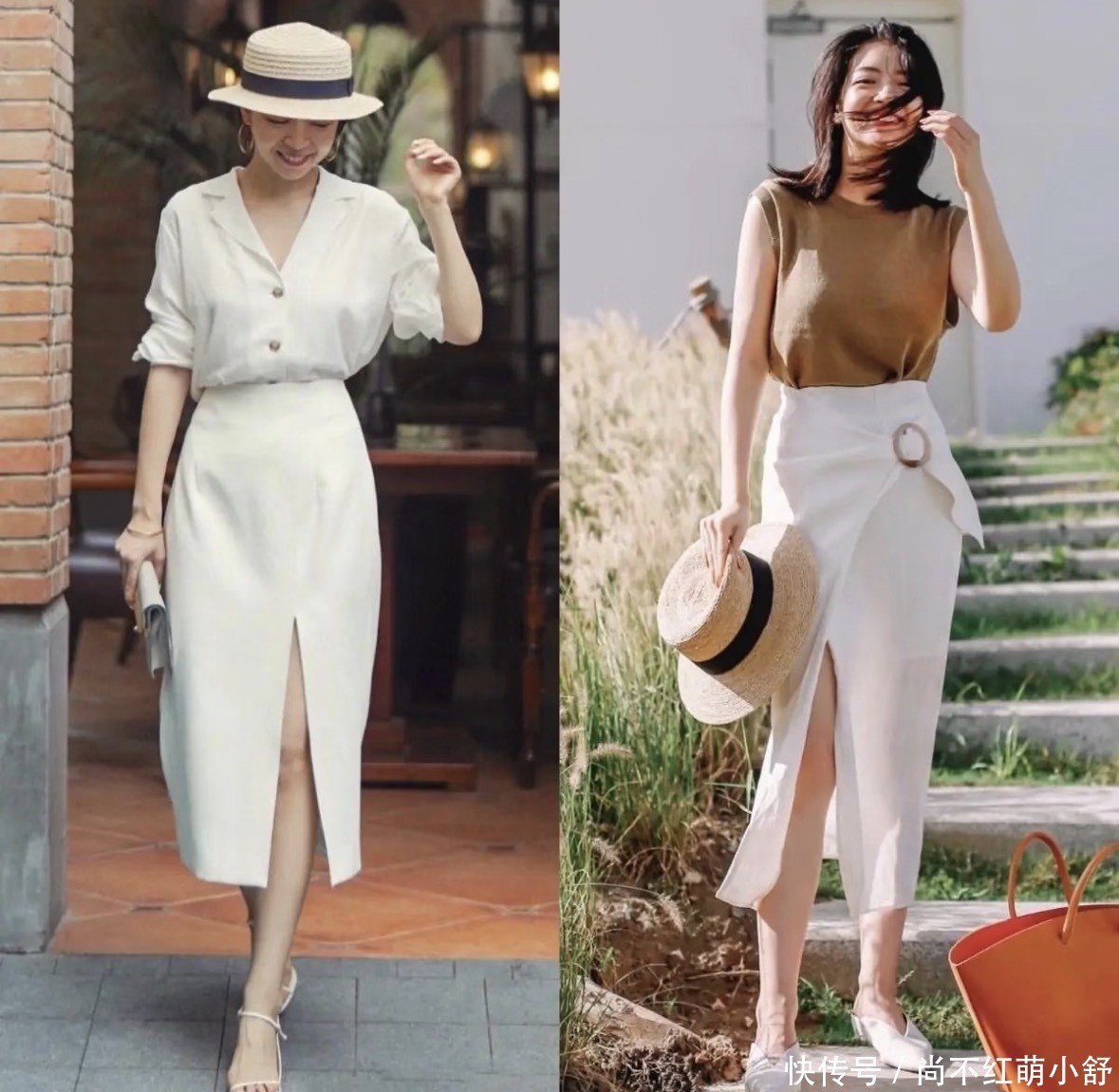 tips1)开叉高度:选一条高腰开叉半身裙,开叉高度在15-20厘米之间最合适,走路时刚好露出小腿最细的部分。
