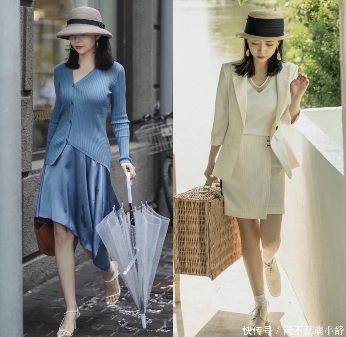 一、博主三木的这几款开衩半身裙穿搭示范,每一套都洋气又显高