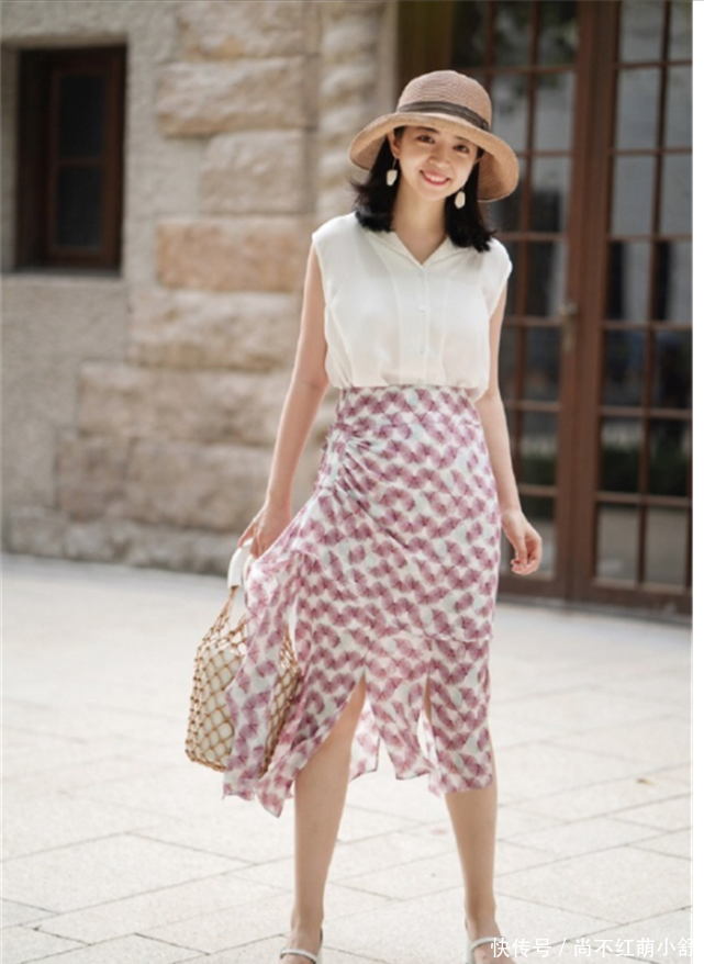 look2、碎花开衩半身裙+白色衬衫,洋气又清爽