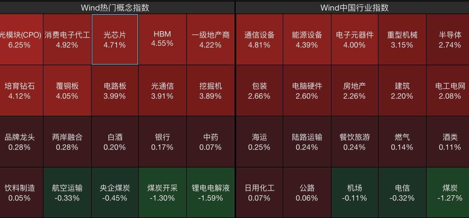 Wind光芯片指数全天上涨了4.71%,电路板、光通信的涨幅也接近4%。